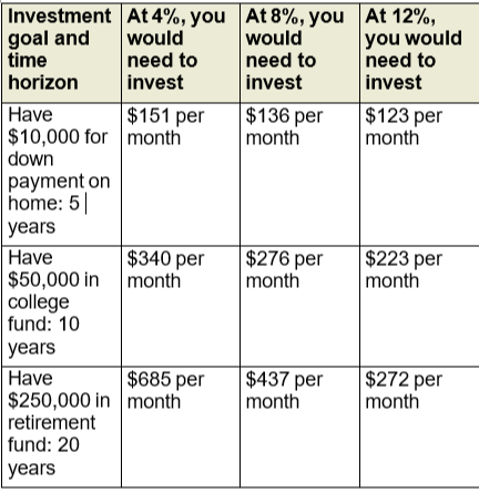 Table assumes 3% annual inflation and that the return is compounded annually; taxes and investment fees are not considered and would reduce the performance shown if they were included. Actual results will vary. Also, rates of return will vary over time, particularly for long-term investments, which could affect the amounts you would need to invest.