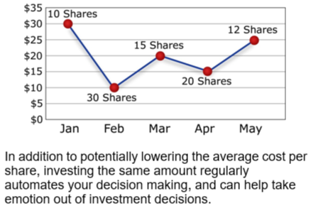 One of the benefits of participating in your workplace savings plan is that you're automatically using an investment strategy called dollar-cost averaging. With dollar-cost averaging, you acquire shares of an investment by investing a fixed dollar amount at regularly scheduled intervals over time. When the price is high, your investment buys less; when prices are low, the same dollar investment will buy more shares. A regular, fixed-dollar investment should result in a lower average price per share than you would get buying a fixed number of shares at each investment interval.
